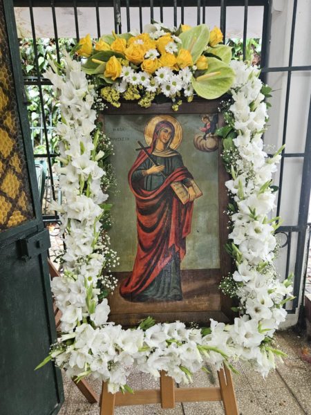 Ακολούθησε, μέσα σε εξαιρετικά ευχάριστο κλίμα, η διανομή του άρτου και διαφόρων γλυκισμάτων και αναψυκτικών στον προαύλιο χώρο του Αγιάσματος, όπου δόθηκε η ευκαιρία στους χριστιανούς μας να συγχαρούν και να ευχηθούν τα χρόνια πολλά στην Ευγεν. κα Παρασκευή-Ρέα Καλφάογλου, Πρόεδρο της Κοινότητας του Αγίου Νικολάου. Μέχρι που έφτασε η ώρα της δύσεως του ηλίου, οπότε κατηφορήσαμε, επιστρέφοντας στα ίδια, αγιασμένοι και ενισχυμένοι από τη χάρη της Οσιομάρτυρος Αγίας.