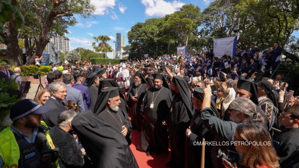Τόσο το εσωτερικό του Καθεδρικού Ναού, όσο και ο περιβάλλων χώρος και οι παρακείμενες οδοί, είχαν κατακλειστεί από χιλιάδες ευσεβείς χριστιανούς, οι οποίοι έσπευσαν να καλωσορίσουν τον Παναγιώτατο, να καταθέσουν την αγάπη και τον σεβασμό τους και να λάβουν την ευλογία του. Κατά την άφιξή του, συνοδεία του Σεβασμιωτάτου Αρχιεπισκόπου Αυστραλίας κ. Μακαρίου, ο Πατριάρχης έγινε αποδέκτης ενθουσιωδών επευφημιών και παρατεταμένων χειροκροτημάτων, ενώ μαθητές και μαθήτριες τον έραναν με ροδοπέταλα υπό τους ήχους χαρμόσυνων κωδωνοκρουσιών.