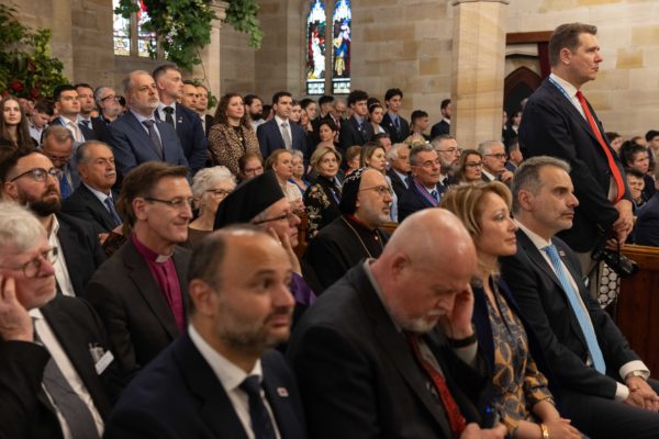 Την τελετή προς τιμήν της ιστορικής, αποστολικής επισκέψεως του Προκαθημένου της Ορθοδόξου Εκκλησίας στην πέμπτη ήπειρο, τίμησαν με την παρουσία τους η Κυβερνήτρια της Νέας Νοτίου Ουαλίας κ. Margaret Beazley, ο Ομοσπονδιακός Πρωθυπουργός της Αυστραλίας κ. Anthony Albanese και ο Υφυπουργός Πολιτισμού της Ελλάδος κ. Ιάσων Φωτήλας, ως εκπρόσωπος της Ελληνικής Κυβερνήσεως. Από πλευράς της τοπικής Εκκλησίας, τον Σεβασμιώτατο Αρχιεπίσκοπο κ. Μακάριο πλαισίωναν οι Θεοφιλέστατοι Επίσκοποι, μέλη της Ιεράς Επαρχιακής Συνόδου. Παρέστησαν, επίσης, οι Ιεράρχες και Κληρικοί, μέλη της Πατριαρχικής Συνοδείας, ο Ιερός Κλήρος και οι Μοναστικές Αδελφότητες της Νέας Νοτίου Ουαλίας, Πρέσβεις και Πρόξενοι, Αυστραλοί Υπουργοί, Βουλευτές και Γερουσιαστές, Άρχοντες της Μ.τ.Χ.Ε., Καθηγητές της Θεολογικής Σχολής του Αποστόλου Ανδρέου, Πρόεδροι των Ενοριών-Κοινοτήτων και των ευαγών Καθιδρυμάτων, μέλη των Φιλοπτώχων Αδελφοτήτων, Διευθυντές, εκπαιδευτικοί και μαθητές σχολείων, κ.ά..