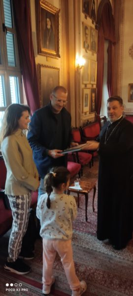 Τους επσκέπτες υποδέχθηκε στο Μέγα Συνοδικό της Σχολής ο Καθηγούμενος, Θεοφιλέστατος Επίσκοπος Αραβισσού κ. Κασσιανός, ο οποίος είχε μακρά συνομιλία μαζί τους για θέματα που αφορούν την παρουσία και τη σύγχρονη δραστηριοποίηση της Σχολής, αλλά και το φλέγον ζήτημα της επαναλειτουργίας της.