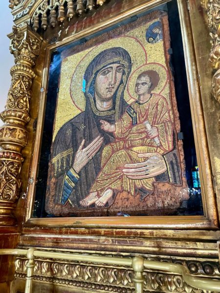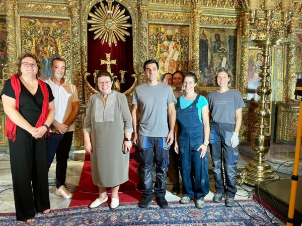 Ακολούθως, ενημερώθηκαν ενδελεχώς από την διευθύντρια του ΕΚΕΒΙΜ Φλώρα Καραγιάννη για την πρόοδο των εργασιών συντήρησης που εκτελούνται τόσο στο τέμπλο, όσο και στις ιερές εικόνες του Πατριαρχικού Ναού του Αγίου Γεωργίου.