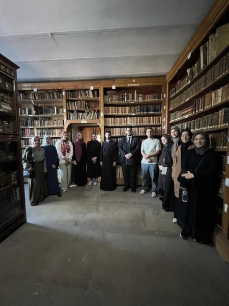 Στην συνέχεια ξεναγήθηκαν στο Καθολικό της Ιεράς Μονής, στις αίθουσες διδασκαλίας και στην βιβλιοθήκη της Σχολής από τον Καθηγούμενο Επίσκοπο Αραβισσού κ. Κασσιανό και τους πατέρες της Ιεράς Μονής Ιερομόναχο π. Μελέτιο Στεφανάτο και Ιερολ. Διάκονο κ. Αβέρκιο Αγόρη.