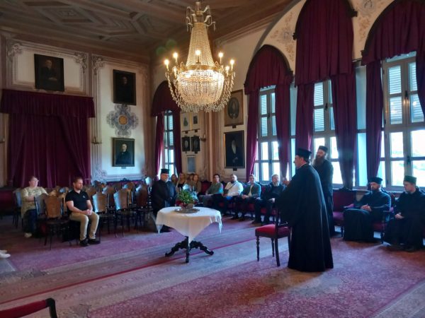Οι Καθηγητές και οι φοιτητές έγιναν δεκτοί στο Μέγα Συνοδικό της Σχολής από τον Καθηγούμενο, Θεοφιλέστατο Επίσκοπο Αραβισσού κ. Κασσιανό, ο οποίος τους καλωσόρισε, μιλώντας τους για την ιστορία και την προσφορά της Σχολής στην Ορθόδοξο Εκκλησία και τον διαχριστιανικό κόσμο.