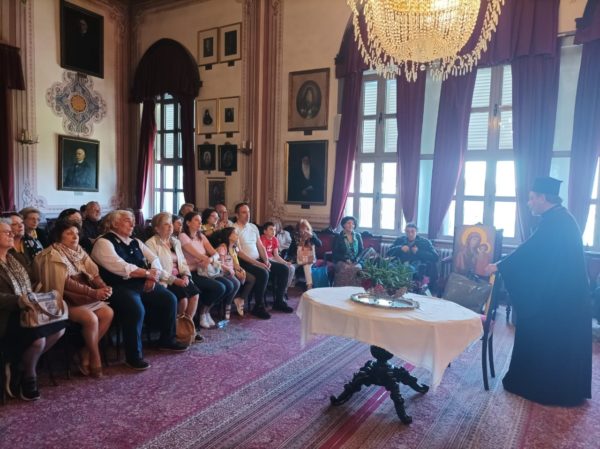 Ακολούθως, ο Καθηγούμενος δέχθηκε τεσσαρακονταμελή όμιλο προσκυνητών από την ενορία Ζωοδόχου Πηγής Δάφνης της Ιεράς Αρχιεπισκοπής Αθηνών, με επικεφαλής τον εφημέριο τους, π. Συμεών Συνοδινό.