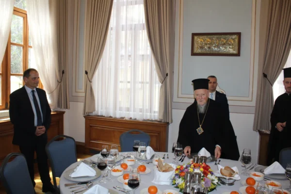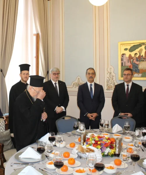 Κι όταν ο Οικουμενικός Πατριάρχης κ.κ. Βαρθολομαίος εισήλθε στην τραπεζαρία για το γεύμα, άπαντες σηκώθηκαν όρθιοι με τον πρέποντα σεβασμό. Νωρίτερα κατά τη συνάντηση στο γραφείο του, λίγες ώρες πριν αναχωρήσει για την Εξόδιο Ακολουθία του Πάπα Φραγκίσκου στο Βατικανό, η υποδοχή του ήταν κάτι περισσότερο από θερμή, εγκάρδια ενώ συνομίλησε επί μακρόν με τον Πρόεδρο κ. Βαφειάδη και τα υπόλοιπα μέλη της Ε.Κ.Α.