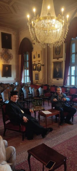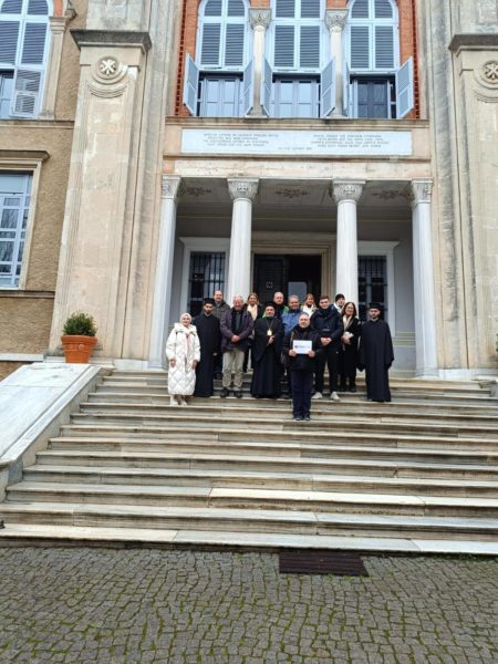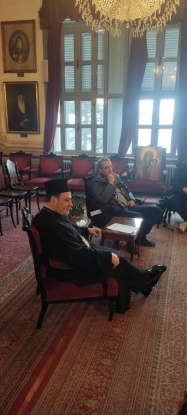 Οι επισκέπτες έγιναν δεκτοί από τον Καθηγούμενο, Θεοφιλέστατο Επίσκοπο Αραβισσού κ. Κασσιανό, στο Μέγα Συνοδικό της Σχολής, όπου τους καλωσόρισε αναφερόμενος στην ιστορία της Θεολογικής Σχολής αλλά και στις καταβαλλόμενες με συστηματικότητα το τελευταίο διάστημα προσπάθειες για την επαναλειτουργία της.