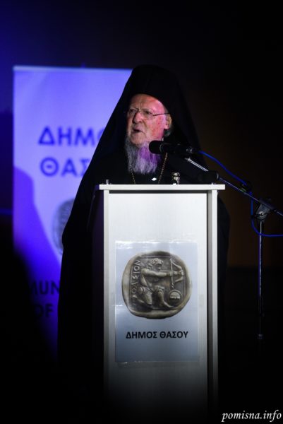 Ο Δήμαρχος Θάσου κ. Λευτέρης Κυριακίδης απηύθυνε προσφώνηση και απένειμε το κλειδί της πόλης στον Οικουμενικό Πατριάρχη τιμώντας το πολυεπίπεδο κοινωνικό, ανθρωπιστικό, περιβαλλοντικό και πνευματικό του έργο. Τιμητική πλακέτα απονεμήθηκε επίσης στον Μητροπολίτη Κιέβου κ.κ. Επιφάνιο.
