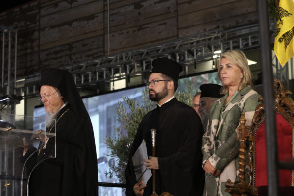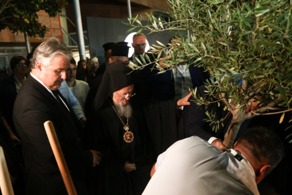 Στη συνέχεια, ο Παναγιώτατος Οικουμενικός Πατριάρχης κ.κ. Βαρθολομαίος μαζί με τον Δήμαρχο κ. Αηδόνη, φύτεψαν έξω από το Δημαρχείο, μία ελιά, ως σύμβολο ειρήνης.