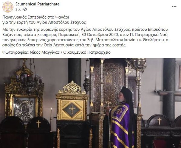 Με την ευκαιρία της εορτής του Αγίου Αποστόλου Στάχυος, πρώτου Επισκόπου Βυζαντίου, τελέστηκε την Παρασκευή, 30 Οκτωβρίου 2020, στον Π. Πατριαρχικό Ναό, πανηγυρικός Εσπερινός χοροστατούντος του Σεβ. Μητροπολίτου Ικονίου κ. Θεολήπτου, ο οποίος θα τελέσει την Θεία Λειτουργία κατά την ημέρα της εορτής.