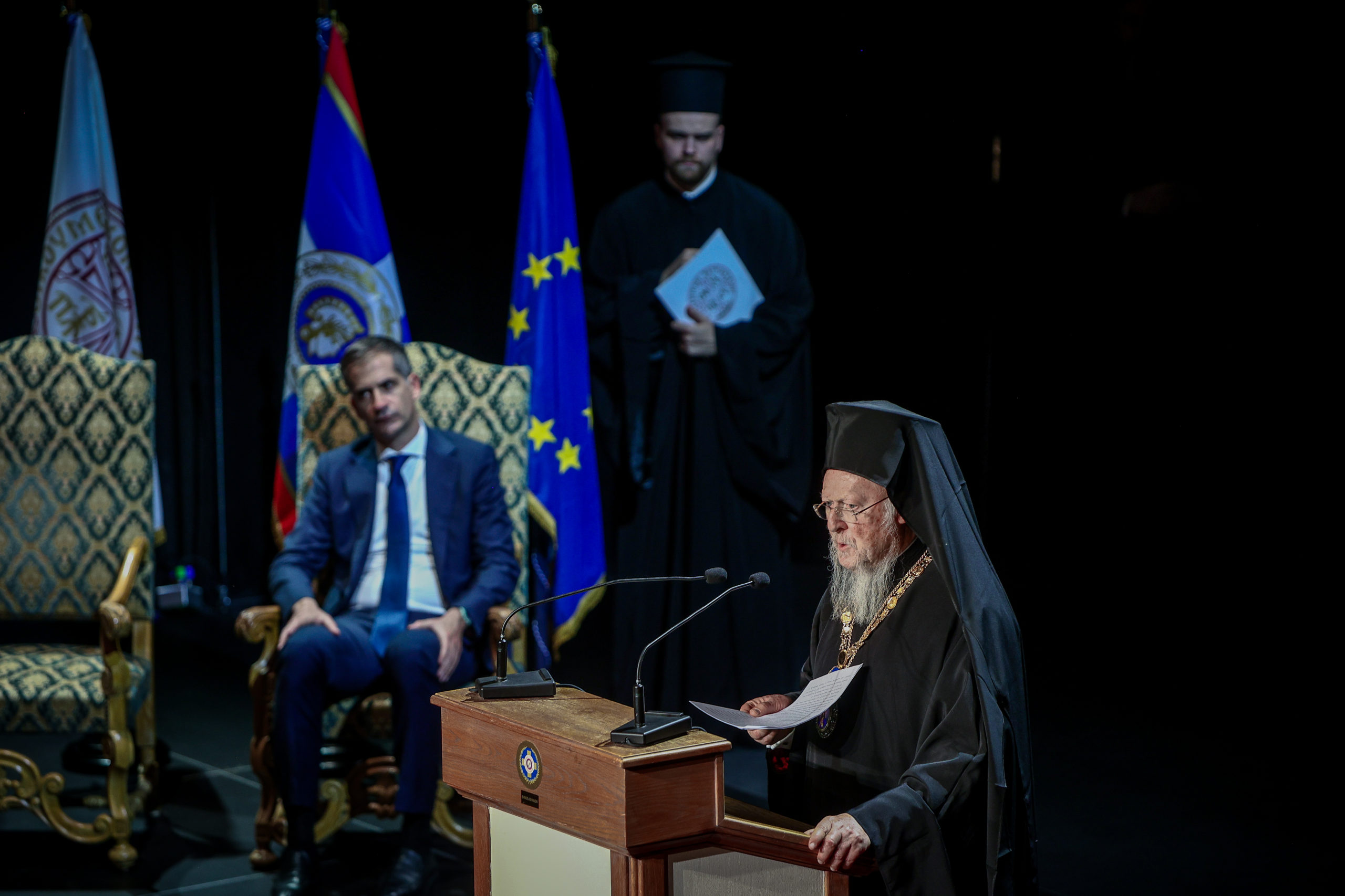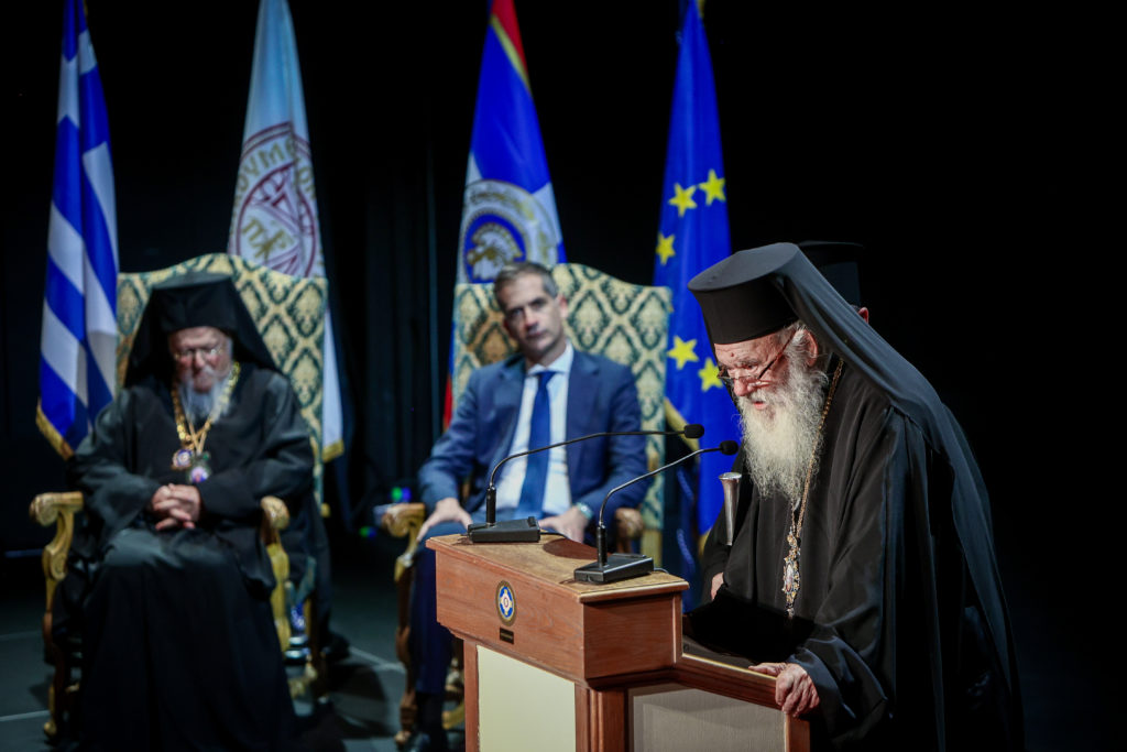Από την πλευρά του ο Αρχιεπίσκοπος Αθηνών και Πάσης Ελλάδος κ.κ. Ιερωνυμος απευθυνόμενος στον Προκαθήμενο της Ορθοδοξίας είπε ότι η τελετή διάκρισης σημειώνει εμφαντικά τις σχέσεις του με την πατρίδα μας, την Ελλάδα και ειδικά με την πόλη των Αθηνών. “