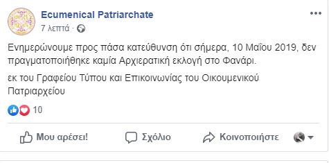 Με ανάρτηση του στην επίσημη σελίδα στο facebook το Οικουμενικό Πατριαρχείο διαψεύδει την είδηση τονίζοντας ότι: “Ενημερώνουμε προς πάσα κατεύθυνση ότι σήμερα, 10 Μαΐου 2019, δεν πραγματοποιήθηκε καμία Αρχιερατική εκλογή στο Φανάρι”.