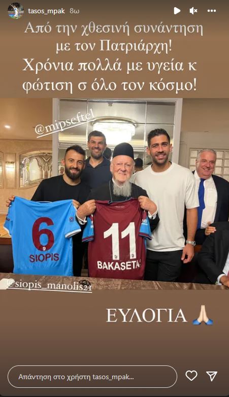 Οι δύο ποδοσφαιριστές χάρισαν στον Παναγιώτατο από μια φανέλα της ομάδας, όπως φαίνεται και από το χαρακτηριστικό story του Τάσου Μπακασέτα σε μέσο κοινωνικής δικτύωσης.