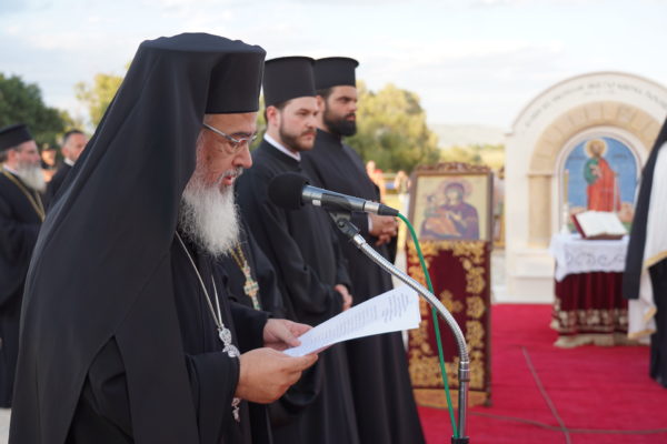 “Ήλθομεν, αγαπητοί, κατά την εορτήν των «υπερλίαν Αποστόλων» (πρβλ. Κορ. Β΄, ια´, 6), των Πρωτοκορυφαίων Πέτρου και Παύλου, ο δεύτερος των οποίων είναι ο θεμελιωτής της Εκκλησίας της ιστορικής και αμφιθαλάσσου Νικοπόλεως και φωτιστής του αυτόχθονος λαού, συνεπώς και ο κατ᾽ εξοχήν προστάτης της ενταύθα ιεράς Αμπέλου του Χριστού. Επικαλούμεθα ευλαβώς την χάριν και ευλογίαν του και τας θεοπειθείς προς Κύριον πρεσβείας του υπέρ πάντων ημών. Ιδιαιτέρως ο τόπος ούτος του Λιθαρίου, πέραν της Ιεράς Μονής των Αγίων Αποστόλων, σεμνύνεται και αγιάζεται ήδη και με το νεοπαγές Προσκυνητάριον του Αποστόλου Παύλου, εις το σημείον όπου το πρώτον εκήρυξε, κατά την παράδοσιν, το Ευαγγέλιον του Χριστού ο μέγας Απόστολος των Εθνών. Πολύς παρά Κυρίου έστω ο μισθός και ο έπαινος των ανεγειράντων αυτό! Η ενταύθα σπορά του ευαγγελικού λόγου υπό του θείου Παύλου απεδείχθη ιδιαιτέρως καρποφόρος, καθόσον όχι μόνον ο λαός της Παλαιάς Ηπείρου έμεινε πιστός εις την Ορθόδοξον Χριστιανικήν πίστιν και Εκκλησίαν του επί δύο ήδη χιλιετίας, πολλάκις μάλιστα εν μέσω φοβερών ιστορικών αναταράξεων, αλλά εδώ επίσης έλαμψαν ως φωστήρες οι Άγιοι Πατέρες Ηλιόδωρος, Δονάτος, Αττικός, Αναστάσιος και Αλκίσων Ιερομάρτυς, Επίσκοποι Νικοπόλεως, τινών των οποίων λαμπραί βασιλικαί εκόσμουν την κατά Στράβωνα «ευδαιμονούσαν πόλιν» της Νικοπόλεως, τα σεβάσμια ερείπια των οποίων είχομεν την ευκαιρίαν να επισκεφθώμεν σήμερον το πρωί, καθώς βεβαίως και ο Όσιος Ονούφριος ο εν Κορωνησία και ο Νεομάρτυς Χρήστος ο εκ Πρεβέζης ο εν Κω μαρτυρήσας και ει τις έτερος! Μαζί των ουράνιος προστάτης σας ορθώς λογίζεται και ο Ιερομάρτυς Άγιος Κοσμάς ο Αιτωλος, ο Ισαπόστολος, όχι μόνον διότι ήλθε και εκήρυξε τον Χριστόν και ενταύθα, υπό συνθήκας μάλιστα λίαν αντιξόους, αλλά και διότι ίδρυσε και εστήριξε το πρώτον Σχολείον διά τους Χριστιανόπαιδας της Πρεβέζης. Ας έχωμεν όλων τας ευχάς και τας προς Θεόν πρεσβείας!”