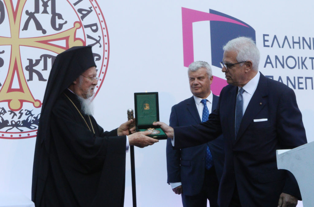 Παρουσία της ΠτΔ κ. Κατερίνας Σακελλαροπούλου και του Αρχιεπισκόπου Αθηνών και πάσης Ελλάδος κ. Ιερωνύμου πραγματοποιήθηκε το απόγευμα η τελετή αναγόρευσης του Οικουμενικού Πατριάρχη κ. Βαρθολομαίου σε Επίτιμο καθηγητή του ΕΑΠ στον τομέα της Διαχείρισης του Περιβάλλοντος.