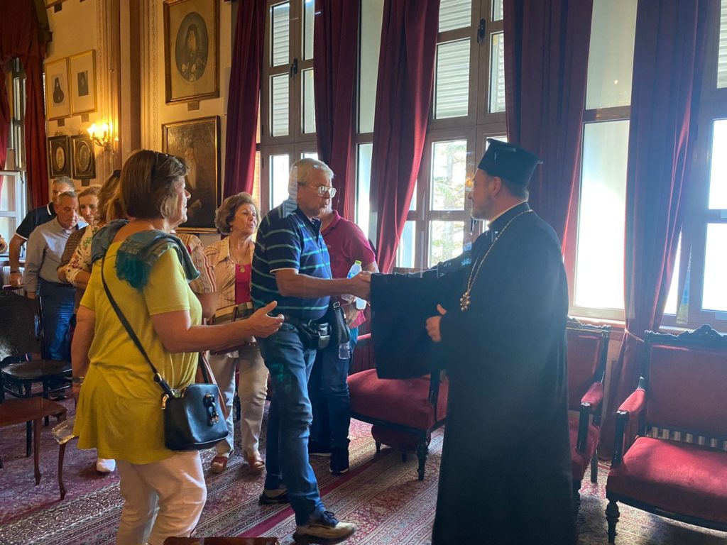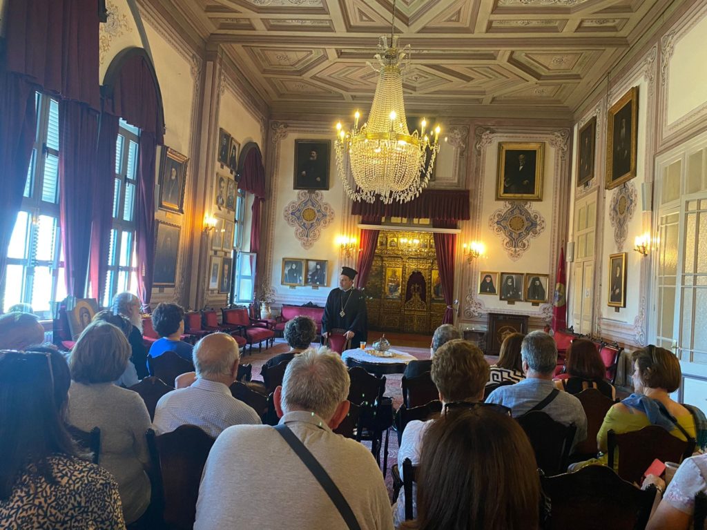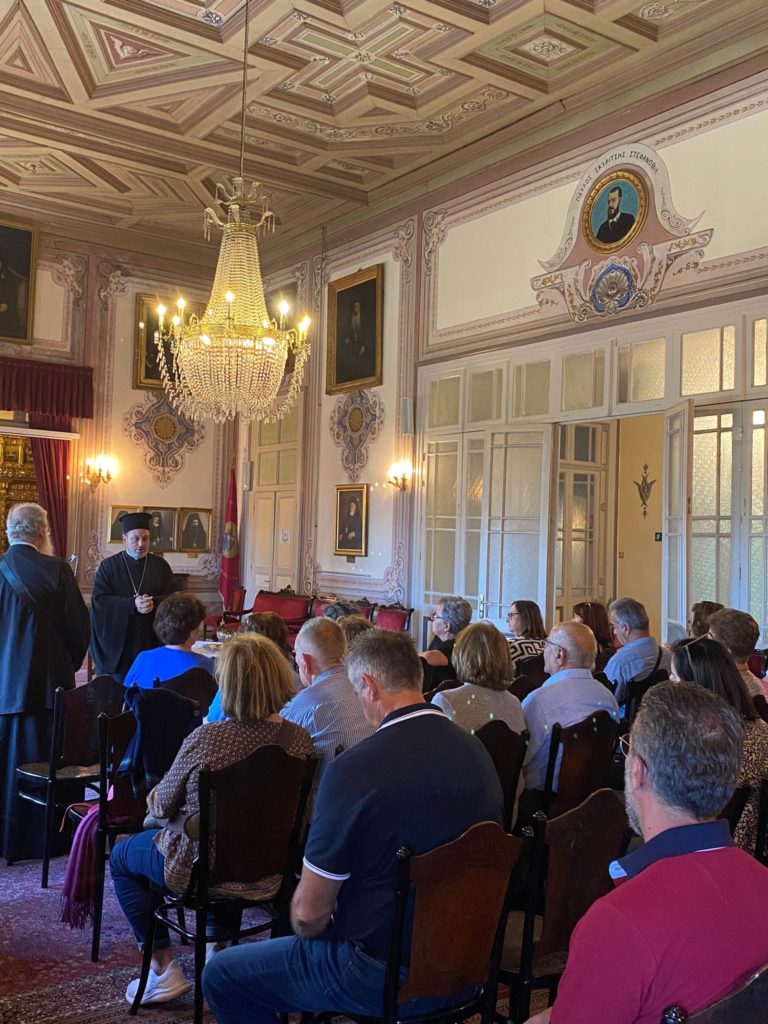 Τους επισκέπτες υποδέχθηκε ο Καθηγούμενος, Θεοφιλέστατος Επίσκοπος Αραβισσού κ. Κασσιανός, μετά της περί αυτόν αδελφότητος, ο οποίος τους καλωσόρισε στο Μέγα Συνοδικό της Σχολής, αναφερόμενος στην ιστορία του πνευματικού καθιδρύματος του Οικουμενικού Πατριαρχείου.