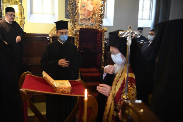 Νωρίτερα, ο Παναγιώτατος χοροστάτησε στη Θεία Λειτουργία που τελέστηκε στο περικαλλές Καθολικό της Ι.Μονής, κατά την οποία εκκλησιάστηκαν οι Σεβ. Αρχιερείς Γέρων Δέρκων κ. Απόστολος, Πρόεδρος της Εφορείας της Ι.Μονής, Γέρων Πριγκηποννήσων κ. Δημήτριος, Ανθηδώνος κ. Νεκτάριος, Επίτροπος του Παναγίου Τάφου στην Πόλη, Σηλυβρίας κ. Μάξιμος, μέλος της Εφορείας της Ι. Μονής, κληρικοί και μοναχοί, καθώς και πιστοί από την Πόλη και τα Πριγκηπόννησα. Μετά την απόλυση ο Παναγιώτατος τέλεσε Τρισάγιο υπέρ αναπαύσεως της ψυχής του αειμνήστου Μητροπολίτου Σταυρουπόλεως κυρού Μαξίμου, τελευταίου Σχολάρχη της Ι.Θεολογικής Σχολής, από τον θάνατο του οποίου συμπληρώθηκαν φέτος 30 χρόνια.