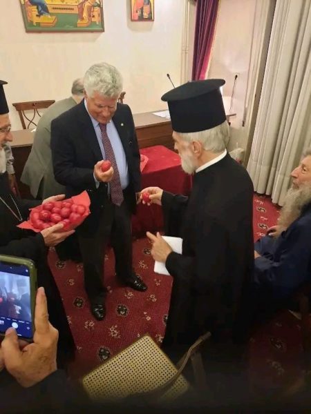 Μετά το πέρας της προβολής, έγινε το Τσούγκρισμα των Πασχαλινών αυγών όπου, ο Πρόεδρος της Εστίας κ. Νικόλαος Ξεξάκης, λαβών τον λόγο ευχαρίστησε του παρευρισκομένους και τους ευχήθηκε, μεταξύ άλλων, να γίνουν πραγματικότητα οι ευχές και η ελπίδα του Σεβασμιωτάτου Φιλαδελφείας κ Μελίτωνος.