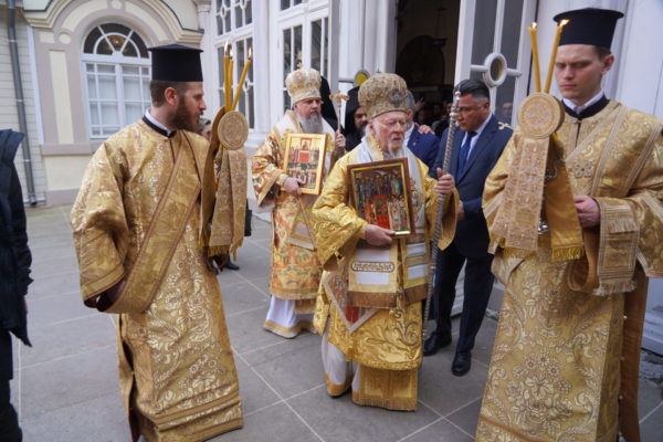 Ακολούθησε η λιτάνευση των Ιερών Εικόνων, στο τέλος της οποίας ο Οικουμενικός Πατριάρχης και ο Μητροπολίτης Κιέβου και πάσης Ουκρανίας ευλόγησαν τους πιστούς από τον εξώστη του Πατριαρχικού Οίκου.