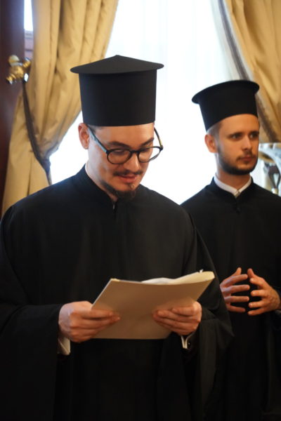 Την παραμονή, παρουσία του Παναγιωτάτου, ο Σεβ. Μητροπολίτης Ιρλανδίας κ. Ιάκωβος, τέλεσε, στο Πατριαρχικό Παρεκκλήσιο του Αγίου Ανδρέου, την Ακολουθία της ρασοφορίας του Ελλογιμ. κ. Αθανασίου Καραγιαννίδη.