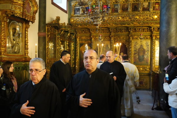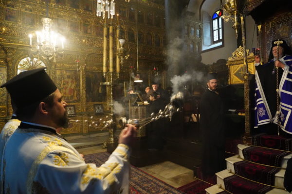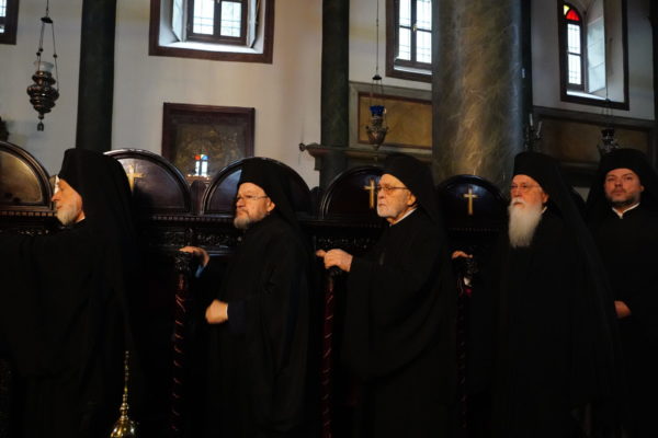 Με τον Παναγιώτατο συγχοροστάτησαν οι Σεβασμιώτατοι Μητροπολίτες Φιλαδελφείας κ. Μελίτων, Μυριοφύτου και Περιστάσεως κ. Ειρηναίος, Μύρων κ. Χρυσόστομος, Λαοδικείας κ. Θεοδώρητος και Προύσης κ. Ιωακείμ.