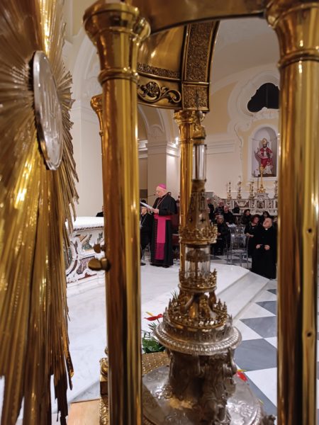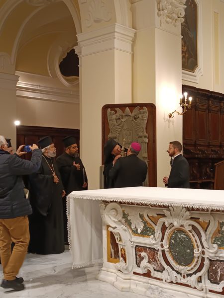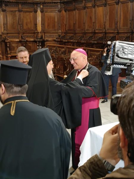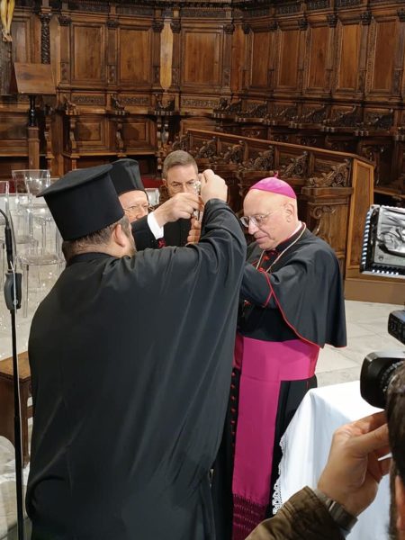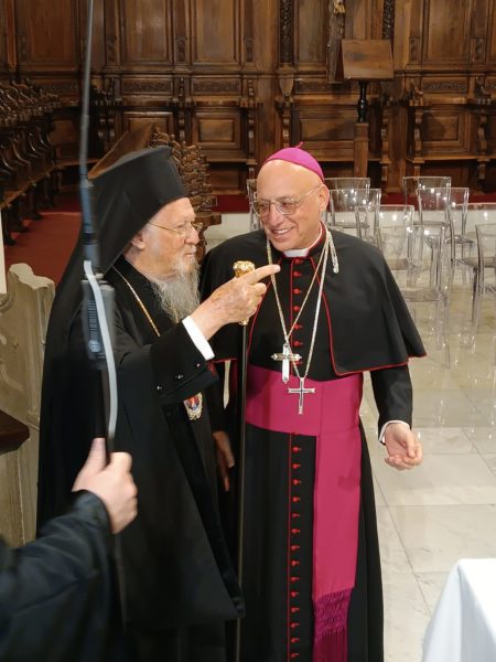 Ο Παναγιώτατος, στην ομιλία του, αναφέρθηκε στην πολυετή γνωριμία του με τον Επίσκοπο Massimiliano, στην ευγένεια, στα χαρίσματα και την ανοικτότητα του χαρακτήρα του, καθώς και στην αφοσιωμένη διακονία του υπέρ των Ρκαθολικών πιστών της Σμύρνης, αργότερα της Τραπεζούντας και σήμερα της Πόλεως.