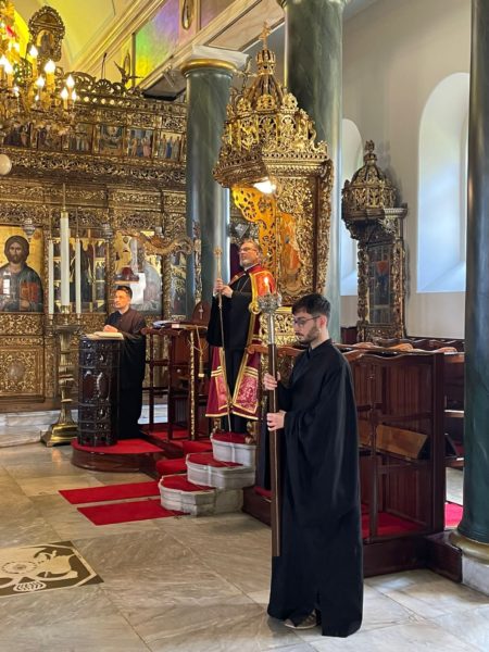 Τελέστηκαν σήμερα οι νενομισμένες ακολουθίες και ο Εσπερινός μετά της Θείας Λειτουργίας του Μεγάλου Βασιλείου στην Θεολογική Σχολή της Χάλκης, χοροστατούντος του Καθηγουμένου, Θεοφιλεστάτου Επισκόπου Αραβισσού κ. Κασσιανού.