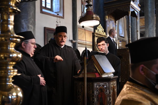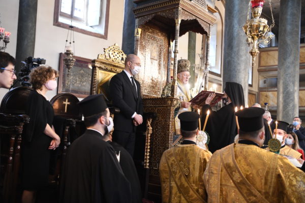 Συμπροσευχήθηκαν οι Σεβ. Μητροπολίτες Γέρων Δέρκων κ. Απόστολος, Γέρων Πριγκηποννήσων κ. Δημήτριος, Φιλαδελφείας κ. Μελίτων, Μυριοφύτου και Περιστάσεως κ. Ειρηναίος, Μύρων κ. Χρυσόστομος, Καλλιουπόλεως και Μαδύτου κ. Στέφανος, Κυδωνιών κ. Αθηναγόρας, ο Σεβ. Αρχιεπίσκοπος Ανθηδώνος Νεκτάριος, Επίτροπος του Παναγίου Τάφου στην Πόλη, οι Θεοφιλ. Επίσκοποι Αλικαρνασσού κ. Αδριανός, Τράλλεων κ. Βενιαμίν και Δαφνουσίας κ. Σμάραγδος, η Αντιπροσωπεία της Αυτονόμου Ορθοδόξου Εκκλησίας της Φιλλανδίας, αποτελούμενη από τον Πανοσιολ. Αρχιμανδρίτη του Οικουμενικού Θρόνου κ. Σέργιο, Ηγούμενο της Ι. Μονής Νέου Βάλαμου, και τον Αιδεσιμολ. Πρωτοπρεσβύτερο κ. Timo Tynkkynen, ο Εξοχ. Πρωθυπουργός της Ουκρανίας κ. Denys Shmyhal, συνοδευόμενος από Υπουργούς και υψηλόβαθμα στελέχη της Κυβερνήσεώς του, Άρχοντες Οφφικιάλιοι της Μεγάλης του Χριστού Εκκλησίας, η Ευγεν. Γενική Πρόξενος της Ελλάδος στην Πόλη κ. Γεωργία Σουλτανοπούλου, καθηγητές των Ομογενειακών Σχολείων, και πιστοί από την Πόλη, τηρουμένων των υγειονομικών μέτρων για την αποτροπή της εξάπλωσης της πανδημίας.