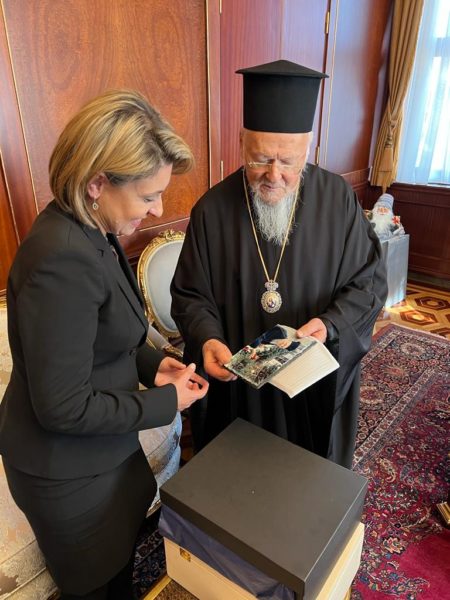 Η κυρία Αλεξοπούλου, κατά τη διάρκεια της χθεσινής κατ’ ιδίαν συνάντησής τους, ευχήθηκε στον Οικουμενικό Πατριάρχη τα έτη της πατριαρχίας του να είναι πολλά και καλλίκαρπα, προς δόξαν Θεού και στήριξη των απανταχού ορθοδόξων, επί τη ευκαιρία της συμπληρώσεως 50 χρόνων από την εκλογή του στη Μητρόπολη Φιλαδελφείας, στις 18 Δεκεμβρίου του 1973.
