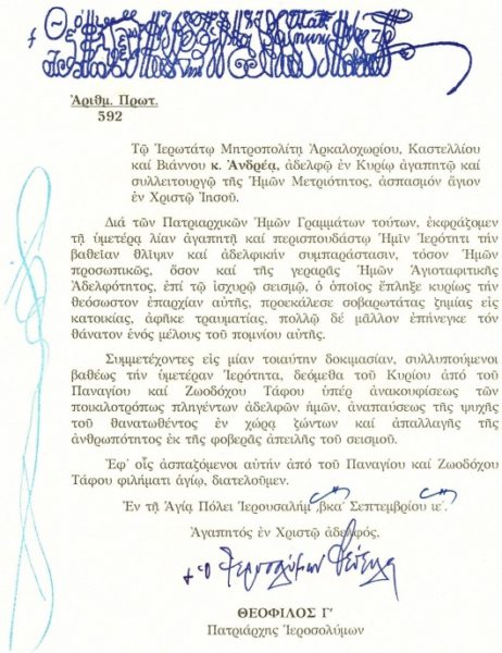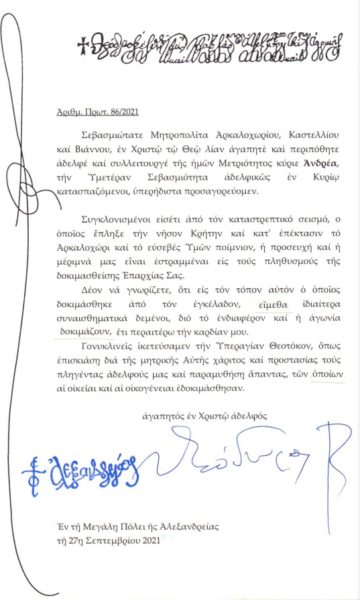 Επιστολές συμπαράστασης από τα Πατριαρχεία Αλεξανδρείας και Ιεροσολύμων εστάλησαν για τον καταστροφικό σεισμό που έπληξε τη Μητρόπολη Αρκαλοχωρίου