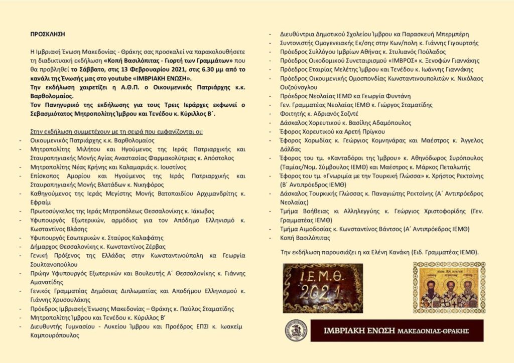 Διαδικτυακή εκδήλωση, αντί της παραδοσιακής τελετής κοπής της βασιλόπιτας για το νέο έτος και την Γιορτή των Γραμμάτων λόγω των μέτρων κατά της πανδημίας, οργάνωσε η Ιμβριακή Ένωση Μακεδονίας – Θράκης το Σάββατο 13 Φεβρουαρίου 2021.
