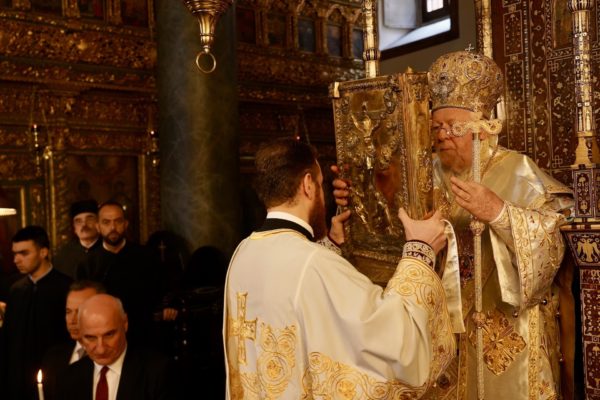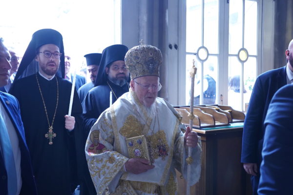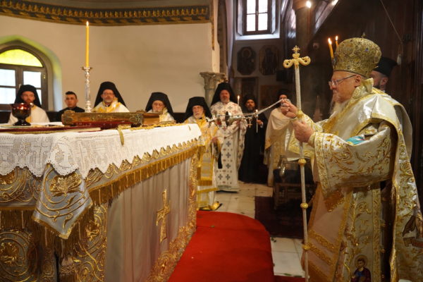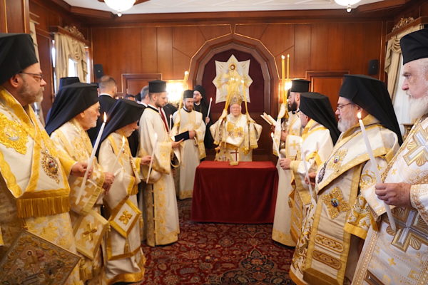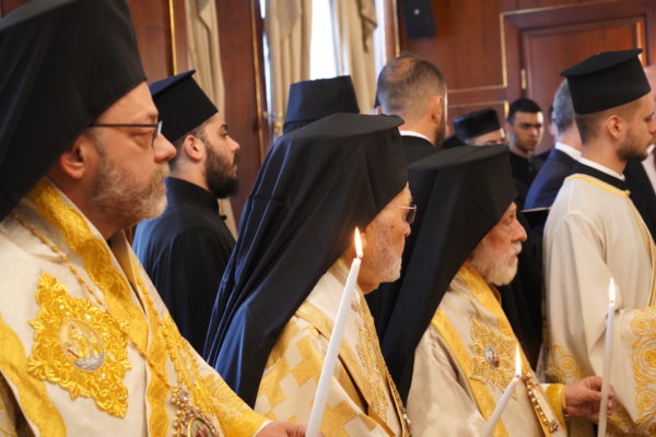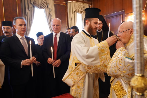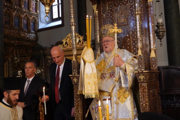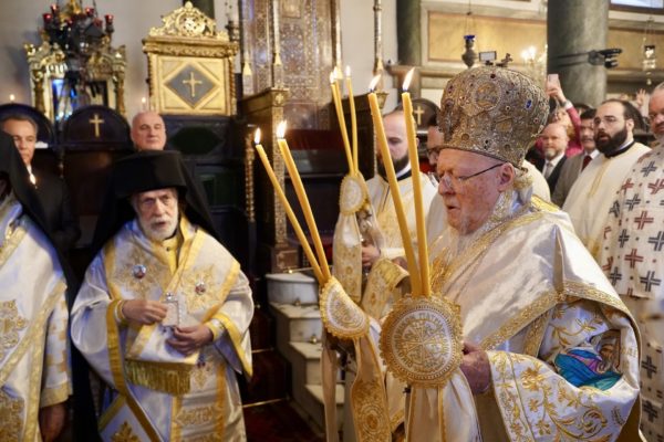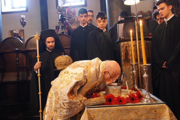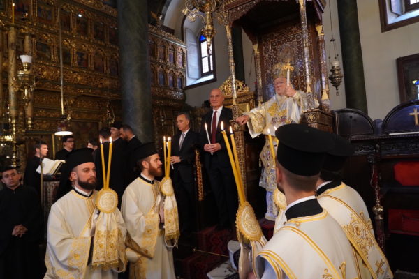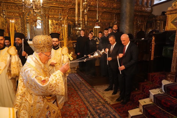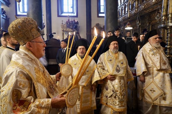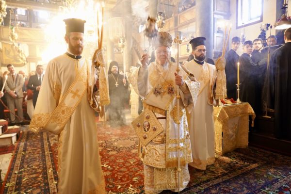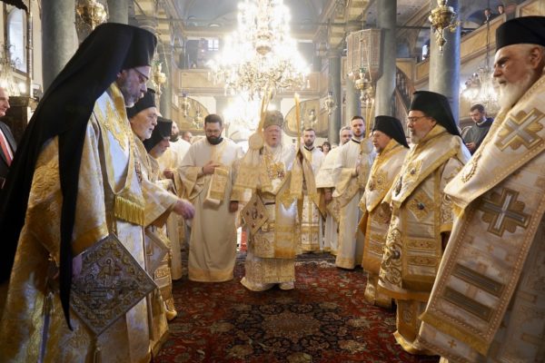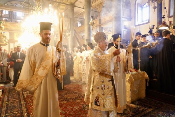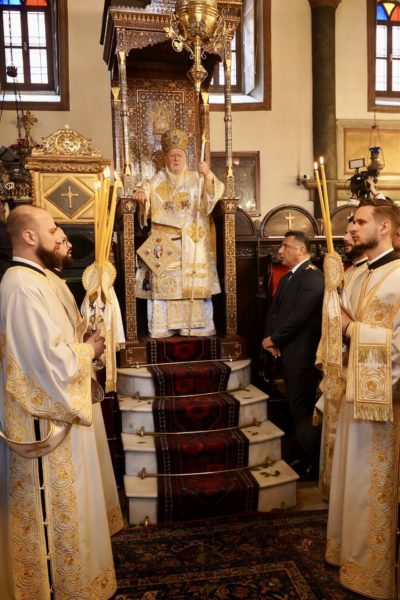 Ο Παναγιώτατος Οικουμενικός Πατριάρχης κ.κ. Βαρθολομαίος, αφού ενδύθηκε με τα Αρχιερατικά άμφια στην Αίθουσα του Θρόνου, περιστοιχούμενος από τους Αρχιερείς Σεβασμιωτάτους Μητροπολίτες Φιλαδελφείας κ. Μελίτωνα, Μυριοφύτου και Περιστάσεως κ. Ειρηναίο, Μύρων κ. Χρυσόστομο, Ικονίου κ. Θεόληπτο, Σελευκείας κ. Θεόδωρο, και τον Θεοφιλέστατο Επίσκοπο Τιβεριουπόλεως κ. Τύχωνα, Ιεράρχη της Εκκλησίας της Βουλγαρίας, καθώς και από τους κληρικούς της Πατριαρχικής Αυλής, κατήλθε στον Πατριαρχικό Ναό και προέστη του Εσπερινού.