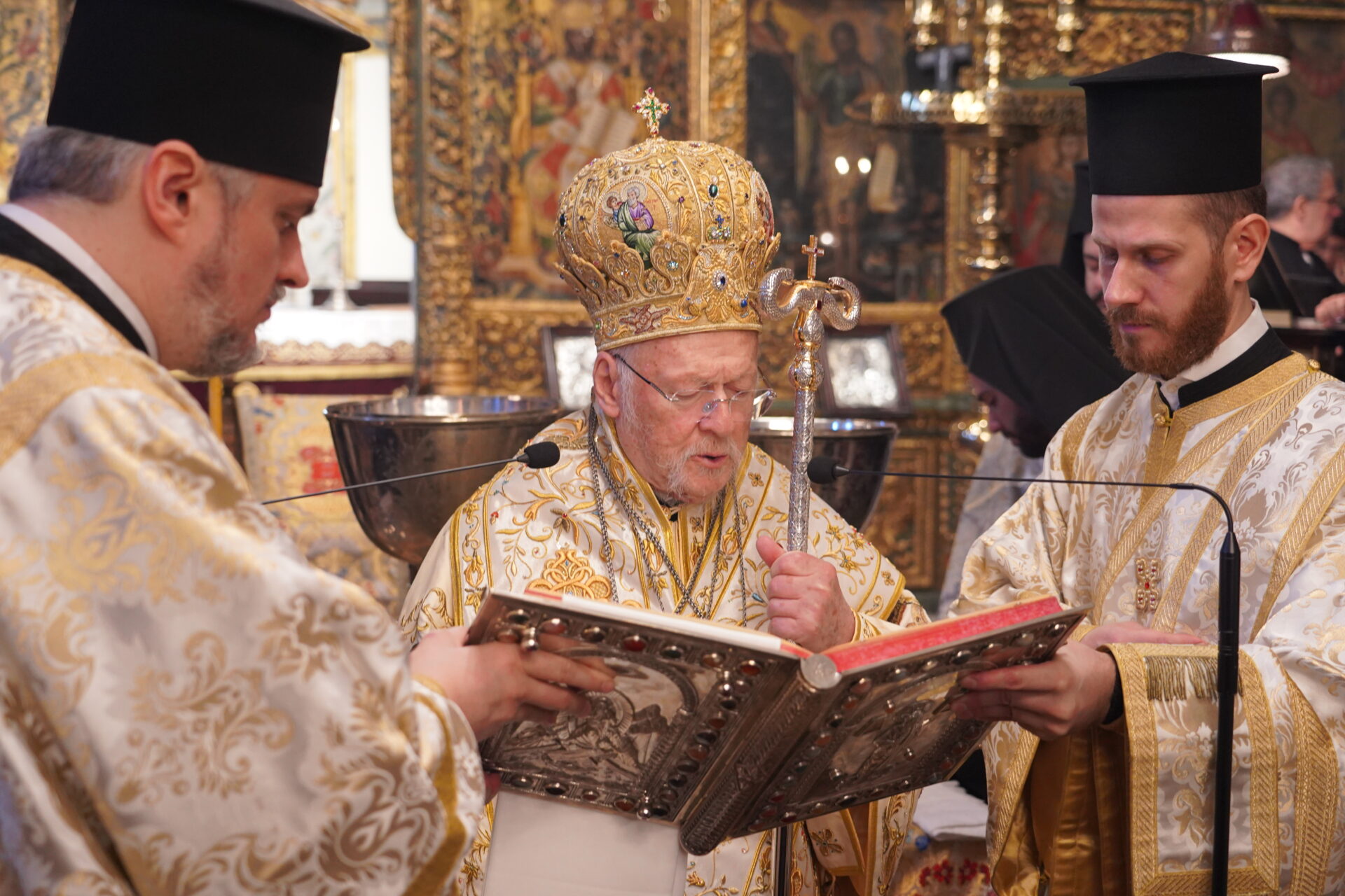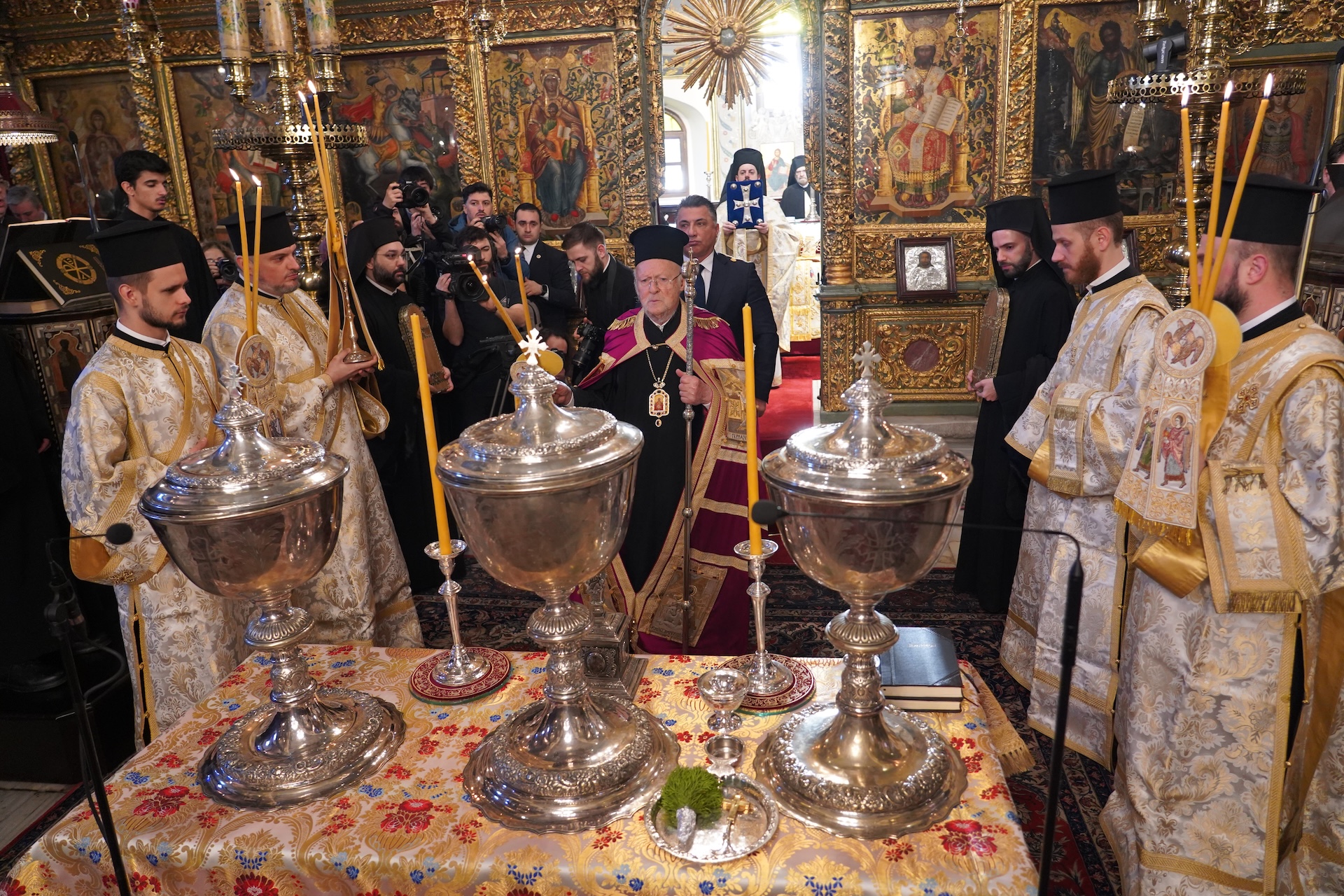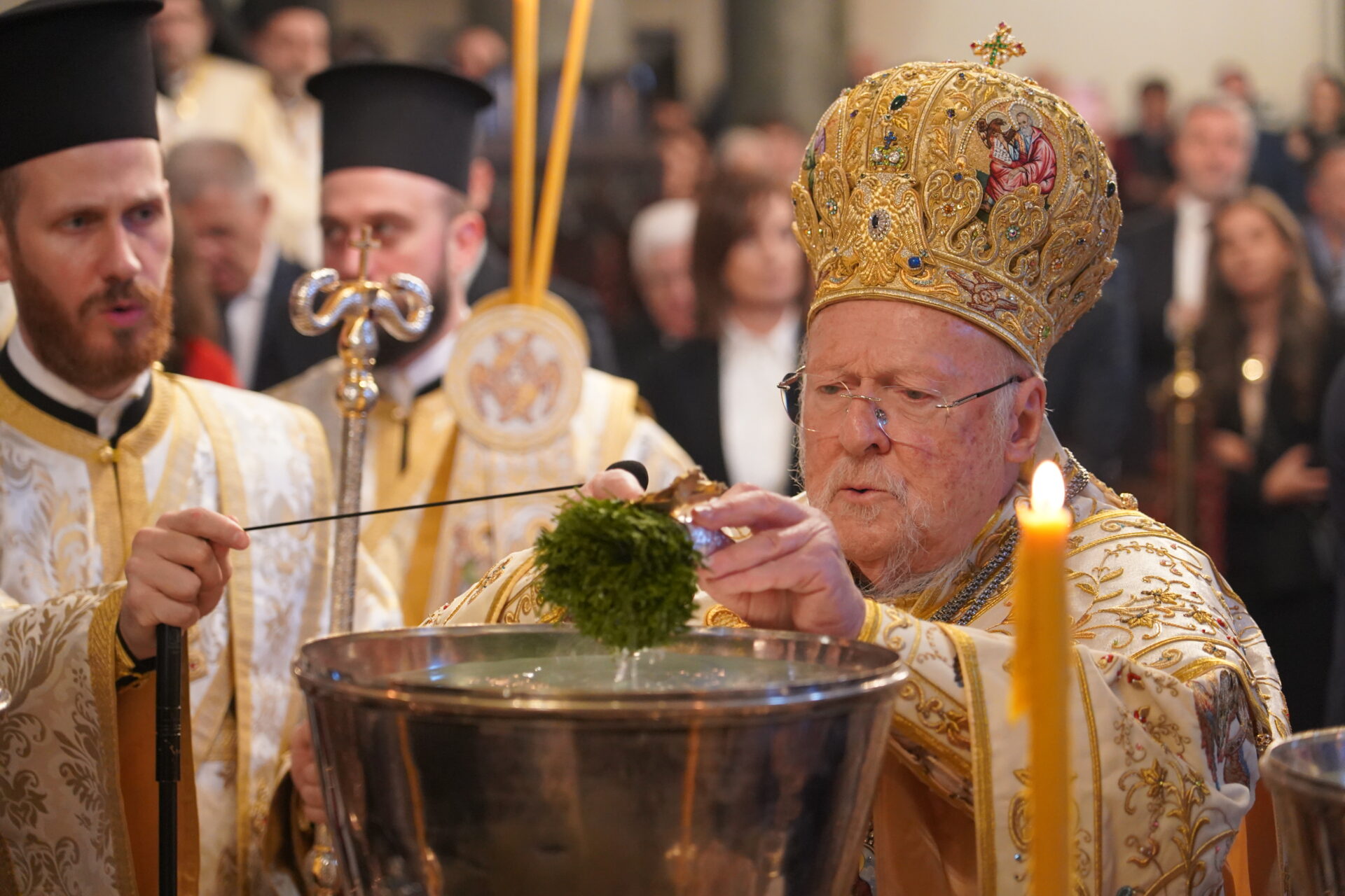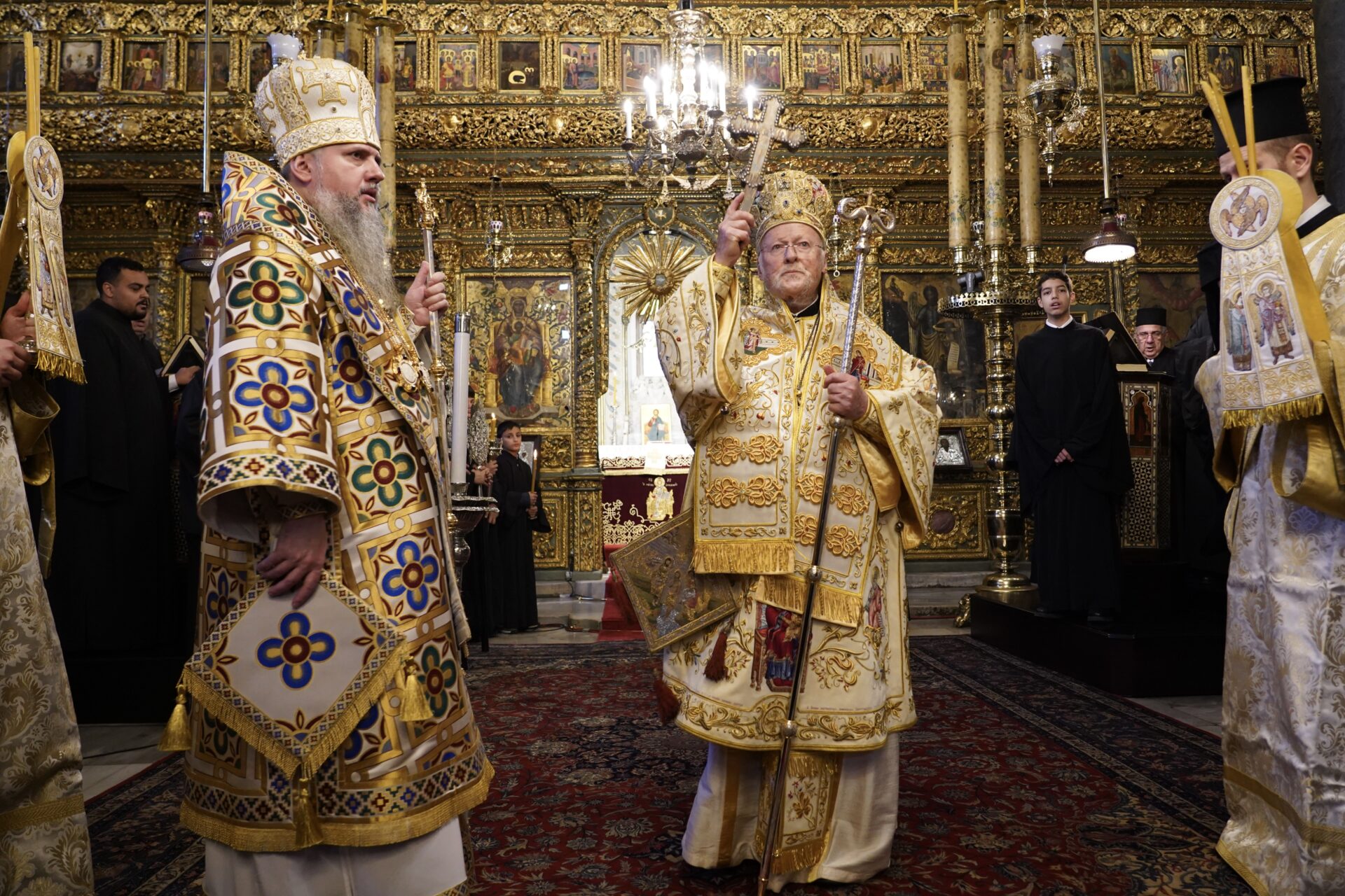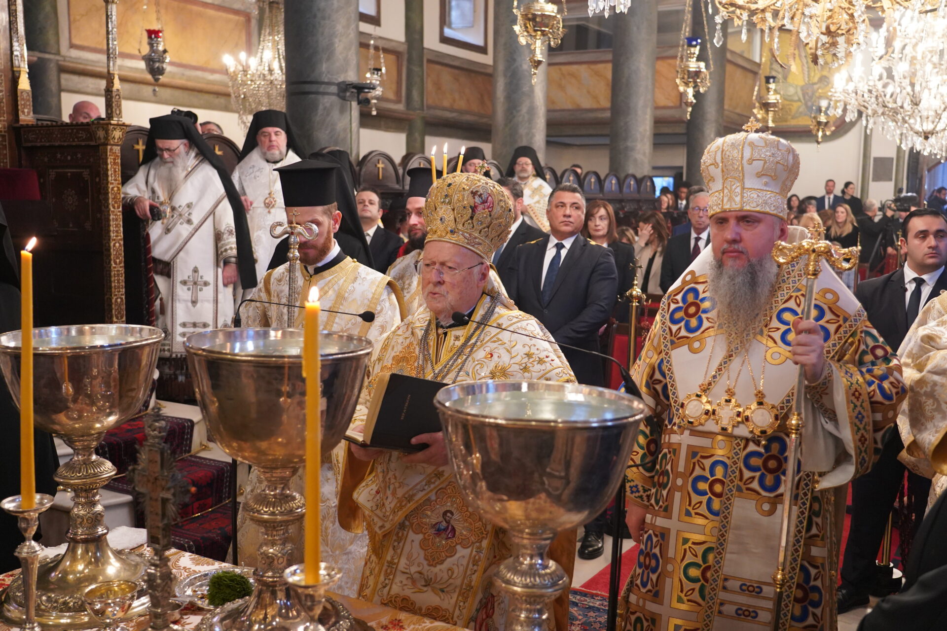 Η Α.Θ. Παναγιότης ο Οικουμενικός Πατριάρχης κ.κ. Βαρθολομαίος, μετά τον Όρθρο, κατά τον οποίο χοροστάτησε, προεξήρχε της τελετής του Μεγάλου Αγιασμού, συμπαραστατούμενος από τον Μακ. Μητροπολίτη Κιέβου και πάσης Ουκρανίας κ.κ. Επιφάνιο, με τον οποίο, ακολούθως, τέλεσαν τη Θεία Λειτουργία, συλλειτουργούντων των Σεβ. Μητροπολιτών Προικοννήσου κ. Ιωσήφ, Βιννίτσης και Μπαρ κ. Συμεών, Μυριοφύτου και Περιστάσεως κ. Ειρηναίου, Μύρων κ. Χρυσοστόμου, Ικονίου κ. Θεολήπτου, Ρίβνε και Οστρόχ κ. Ιλαρίωνος, Κρήνης κ. Κυρίλλου και Σελευκείας κ. Θεοδώρου.