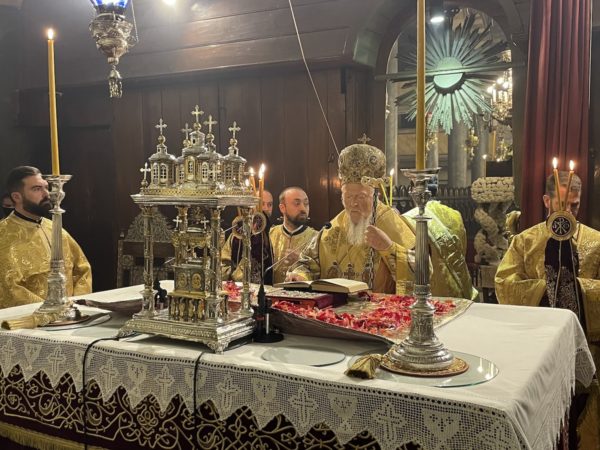 Ο Οικουμενικός Πατριάρχης προσκύνησε πρώτος και ακολούθησαν οι συγχοροστατούντες Αρχιερείς, οι Κληρικοί της Πατριαρχικής Αυλής, οι Πατριαρχικοί Χοροί, και οι παριστάμενοι Άρχοντες Οφφικιάλιοι του Οικουμενικού Θρόνου, στους οποίους ο Παναγιώτατος μοίρασε τα καθιερωμένα άνθη.