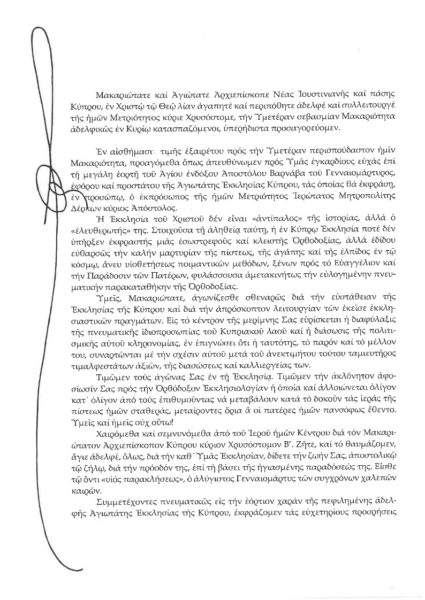 Τις εγκάρδιες ευχές του στον Μακαριώτατο Αρχιεπίσκοπο Κύπρου κ.κ. Χρυσόστομο απέστειλε ο Παναγιώτατος Οικουμενικός Πατριάρχης κ.κ. Βαρθολομαίος για τη Θρονική Εορτή της Εκκλησίας της Κύπρου, του Αποστόλου Βαρνάβα, τονίζοντας πως η Εκκλησία του Χριστού δεν είναι αντίπαλος της ιστορίας του κόσμου, αλλά ελευθερωτής της! Ακολούθως, κάνει λόγο για τα χαρίσματα της Εκκλησίας της Κύπρου και τους αγώνες του Μακαριωτάτου Αρχιεπισκόπου της.