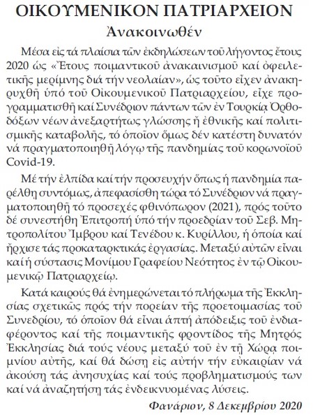 Το προσεχές Φθινόπωρο του 2021 αναμένεται να πραγματοποιηθεί τελικά το Συνέδριο Νεολαίας του Οικουμενικού Πατριαρχείο. Το συνέδριο είχε προγραμματιστεί στο πλαίσιο των εκδηλώσεων της τρέχουσας χρονιάς, που έχει ανακηρυχθεί ως “Ετος Ποιμαντικού Ανακαινισμού και Οφειλετικής Μερίμνης για την Νεολαίαν” αλλά αναβλήθηκε λόγω της πανδημίας.