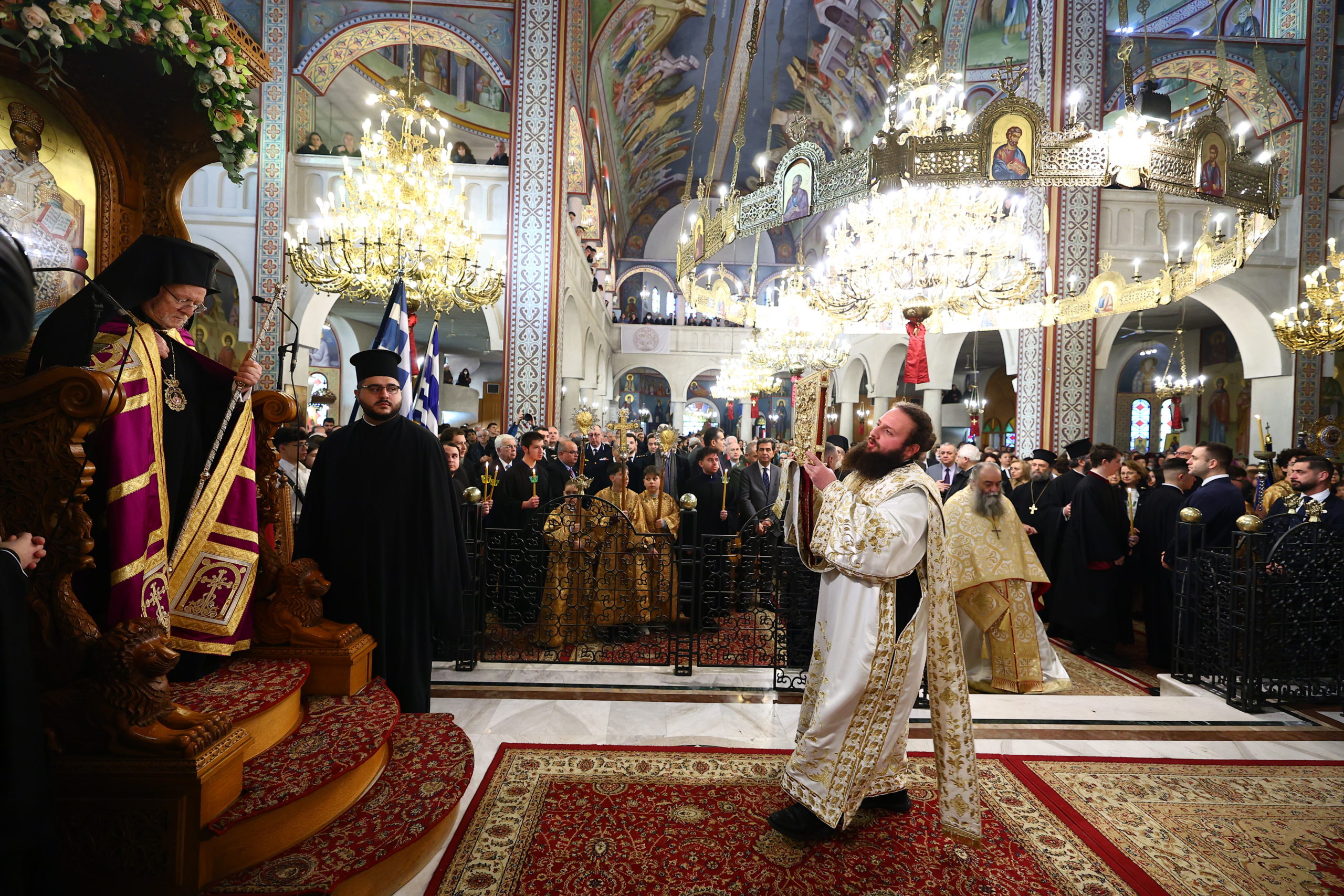 Τον Οικουμενικό Πατριάρχη προσφώνησε και χαιρέτησε, ως εκπρόσωπος του Αρχιεπισκόπου Αθηνών και Πάσης Ελλάδος, ο Μητροπολίτης Θεσσαλονίκης κ. Φιλόθεος, αναφερόμενος στο μήνυμα της γιορτής, αλλά και στο δύσκολο και πολλές φορές «σταυρικό έργο» του προκαθημένου της Ορθόδοξης Εκκλησίας, προκάτοχοι του οποίου υπήρξαν δύο από τους Τρεις Ιεράρχες.