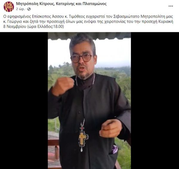 Ο εψηφισμένος Επίσκοπος Άσσου κ. Τιμόθεος ευχαριστεί τον Σεβασμιώτατο Μητροπολίτη Κίτρους, Κατερίνης και Πλαταμώνος κ. Γεώργιο και ζητά την προσευχή όλων ενόψει της χειροτονίας του την προσεχή Κυριακή 8 Νοεμβρίου (ώρα Ελλάδος:18.00).