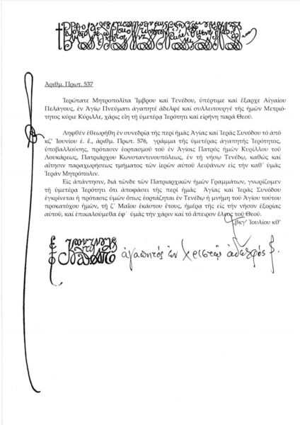 Το απαντητικό Γράμμα του Οικουμενικού Πατριάρχη: