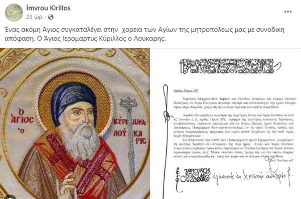 “Ένας ακόμη Άγιος συγκαταλέγει στην χορεια των Αγίων της μητροπόλεως μας με συνοδικη απόφαση. Ο Άγιος Ιερομαρτυς Κύριλλος ο Λουκαρις”, έγραψε σε ανάρτησή του ο Μητροπολίτης Ίμβρου και Τενέδου κ. Κύριλλος γνωστοποιώντας την είδηση.