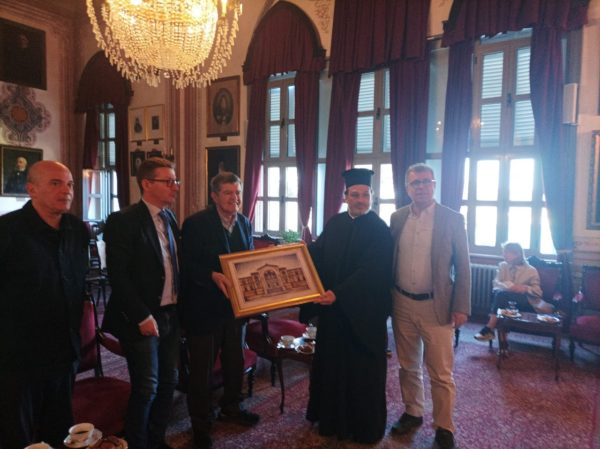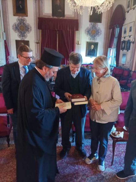 Κατόπιν, τους υψηλούς επισκέπτες υποδέχθηκε ο Καθηγούμενος στο Μέγα Συνοδικό της Σχολής, όπου εξέφρασε τις θερμές ευχαριστίες του στον Άρχοντα Αθανάσιο Μαρτίνο για την πολύ σημαντική δωρεά του, με την οποία πραγματοποιείται η εκ βάθρων ανακαινιση του κτιριακού συγκροτήματος της Σχολής και τόνισε την σημασία του έργου.