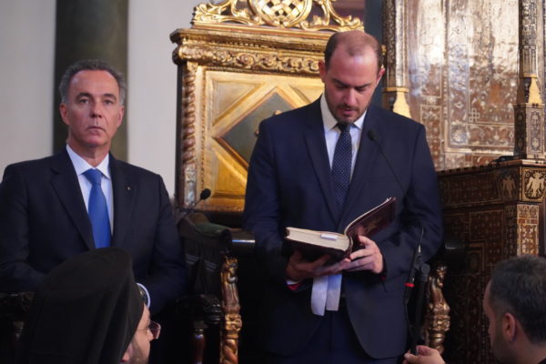Ακολούθησε δεξίωση στην Αίθουσα του Θρόνου, μετά την οποία ο Παναγιώτατος δέχθηκε σε κατ’ ιδίαν συνάντηση τον Υφυπουργό Εξωτερικών κ. Γ. Κώτσηρα, ο οποίος μετέφερε στη Μητέρα Εκκλησία τις ευχές της Ελληνικής Κυβερνήσεως.