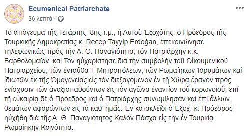 Το απόγευμα της Τετάρτης, ο Πρόεδρος της Τουρκικής Δημοκρατίας κ. Recep Tayyip Erdoğan, επικοινώνησε τηλεφωνικώς προς την Α. Θ. Παναγιότητα, τον Πατριάρχην κ.κ. Βαρθολομαίο, και Τον ευχαρίστησε για την συμβολή του Οικουμενικού Πατριαρχείου, των Ι. Μητροπόλεων, των Ρωμαίηκων Ιδρυμάτων και ιδιωτών της Ομογενείας στον διεξαγόμενο στη Χώρα έρανο προς ενίσχυσιν των αναξιοπαθούντων στον αγώνα εναντίον του κορωνοιού, επί τη ευκαιρία δε ο Πρόεδρος και ο Πατριάρχης συνωμίλησαν και επί άλλων θεμάτων αφορώντων τα του Οικουμενικού Πατριαρχείου και άλλων πεδίων. Εν κατακλείδι ο κ. Recep Tayyip Erdoğan ηυχήθη διά της Α. Θ. Παναγιότητος Καλόν Πάσχα στην εν Τουρκία Ρωμαίηκη Κοινότητα.