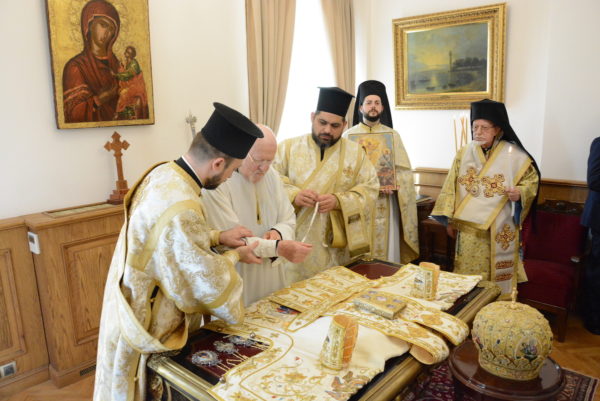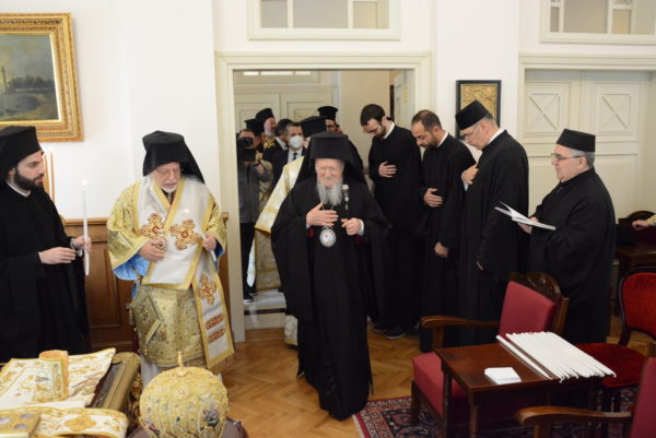 Ο Παναγιώτατος Οικουμενικός Πατριάρχης, αφού ενδύθηκε με τα Αρχιερατικά άμφια, περιστοιχιζόμενος από τους Σεβ. Μητροπολίτες Μοσχονησίων κ. Κύριλλο, Ανέων κ. Μακάριο, Φιλαδελφείας κ. Μελίτωνα, Σεβαστείας κ. Σεραφείμ, Μυριοφύτου και Περιστάσεως κ. Ειρηναίο, Μύρων κ. Χρυσόστομο, Ειρηνουπόλεως κ. Νίκανδρο, και Προύσης κ. Ιωακείμ, και από τους κληρικούς της Πατριαρχικής Αυλής, έφθασε, εν πομπή, στον Πατριαρχικό Ναό και προέστη του Εσπερινού.