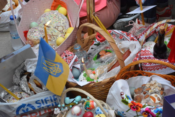 Στο αυλόγυρο του Πατριάρχειου, ο Ουκρανικής καταγωγής Πανοσιολ. Μ. Σύγκελλος κ. Ιάκωβος, αγίασε τα τρόφιμα και τα γλυκά που, σύμφωνα με το έθιμό τους, έφεραν οι εκατοντάδες Ουκρανοί πιστοί, όπως κάνουν κάθε χρόνο την ημέρα του Αγίου Πάσχα.