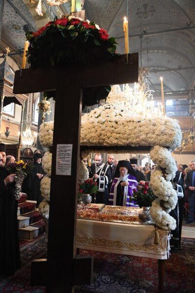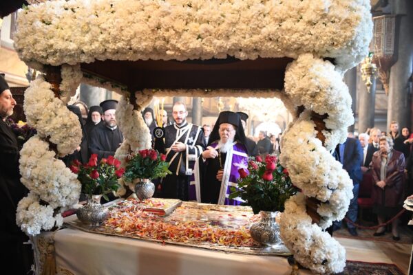 Ο Οικουμενικός Πατριάρχης προσκύνησε πρώτος και ακολούθησαν οι Ιεράρχες, ο Ιερός Κλήρος και το πολυπληθές εκκλησίασμα. Σε όλους ο Πατριάρχης μοίρασε τα καθιερωμένα άνθη.