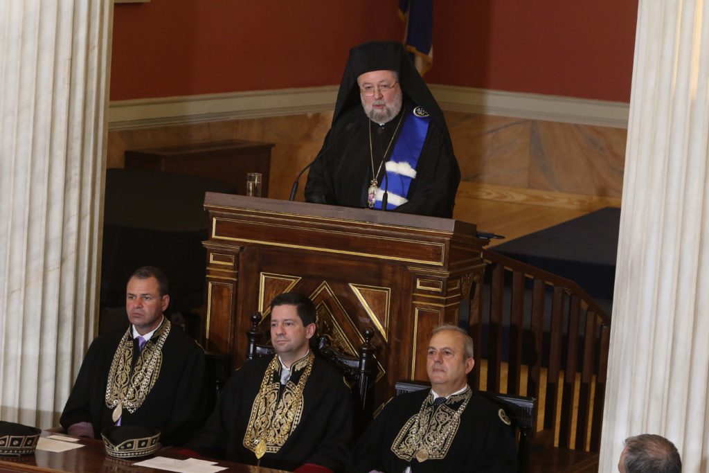 Η τελετή έλαβε χώρα στη Μεγάλη Αίθουσα του Πανεπιστημίου Αθηνών και παρέστησαν, επίσης, εκπρόσωποι της Πολιτείας, υπουργοί, βουλευτές, πλειάδα Αρχιερέων, ακαδημαϊκοί, κλήρος και λαός.