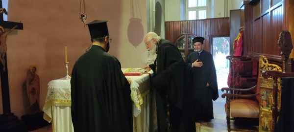 Ο Πανιερώτατος και η συνοδεία του έγιναν δεκτοί από τον Καθηγούμενο, Θεοφιλέστατο Επίσκοπο Αραβισσού κ. Κασσιανό, και την περί αυτόν αδελφότητα και ξεναγήθηκαν στους χώρους της Σχολής. Στη συνέχεια ο Πανιερώτατος χοροστάτησε από του παραθρονίου κατά τον προεόρτιο της Γεννήσεως της Θεοτόκου Εσπερινό στο ναΰδριο της Σχολής.