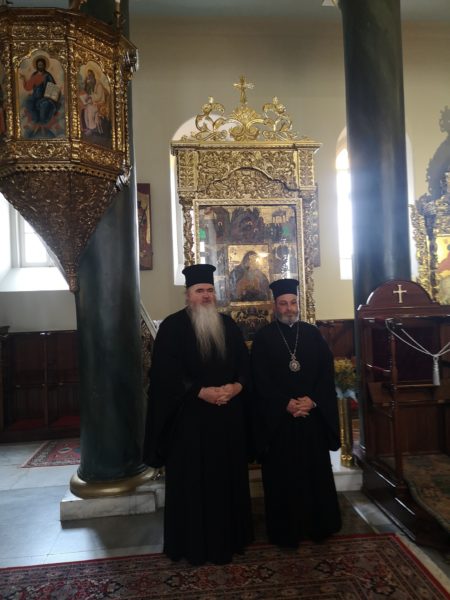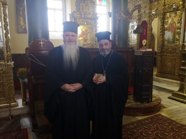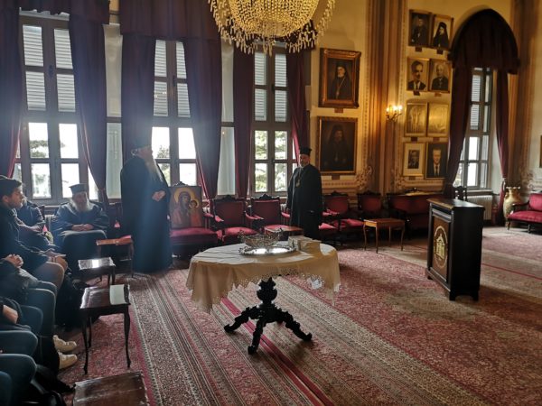 Κατά την προσφώνησή του προς τον Σεβασμιώτατο κ. Ιουστίνο και τον περί αυτόν όμιλο προσκυνητών ο άγιος Καθηγούμενος αναφέρθηκε στην ιστορία της Σχολής, στην παρατεινομένη αδικία της αναστολής της λειτουργίας της προ 52 ετών, ενώ εξέφρασε την χαρά του για την παρούσα επίσκεψη.