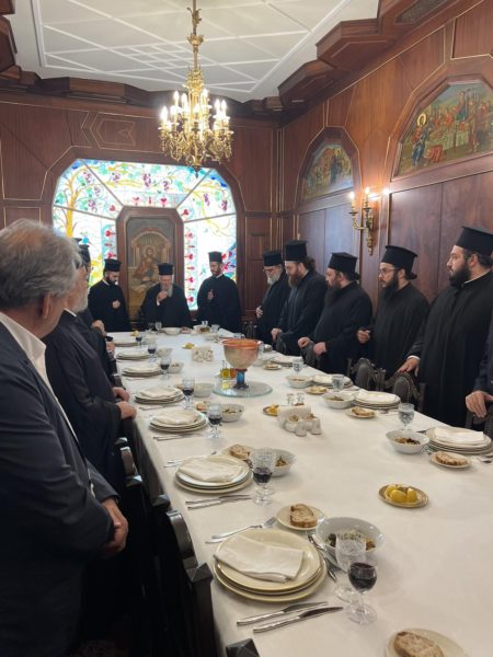 Στη συνέχεια, ο Πανιερώτατος και η συνοδεία του παρακάθισαν μετά του Οικουμενικού Πατριάρχου στην Πατριαρχική τράπεζα και έγινε ανταλλαγή δώρων.