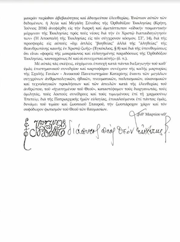 Ο Οικ. Πατριάρχης χαιρετίζει το Συνέδριο της Σχολής Γονέων Κατερίνης